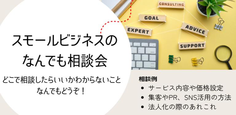 ビジネスの立ち上げやステップアップしたいと思う時の悩み事は多岐にわたります。「スモールビジネスのなんでも相談会」では、他の人の意見を聞きたいこと、どこに相談すれば良いかわからないこと、何でもご相談いただけます。 検索した … 続きを読む スモールビジネスのなんでも相談会
